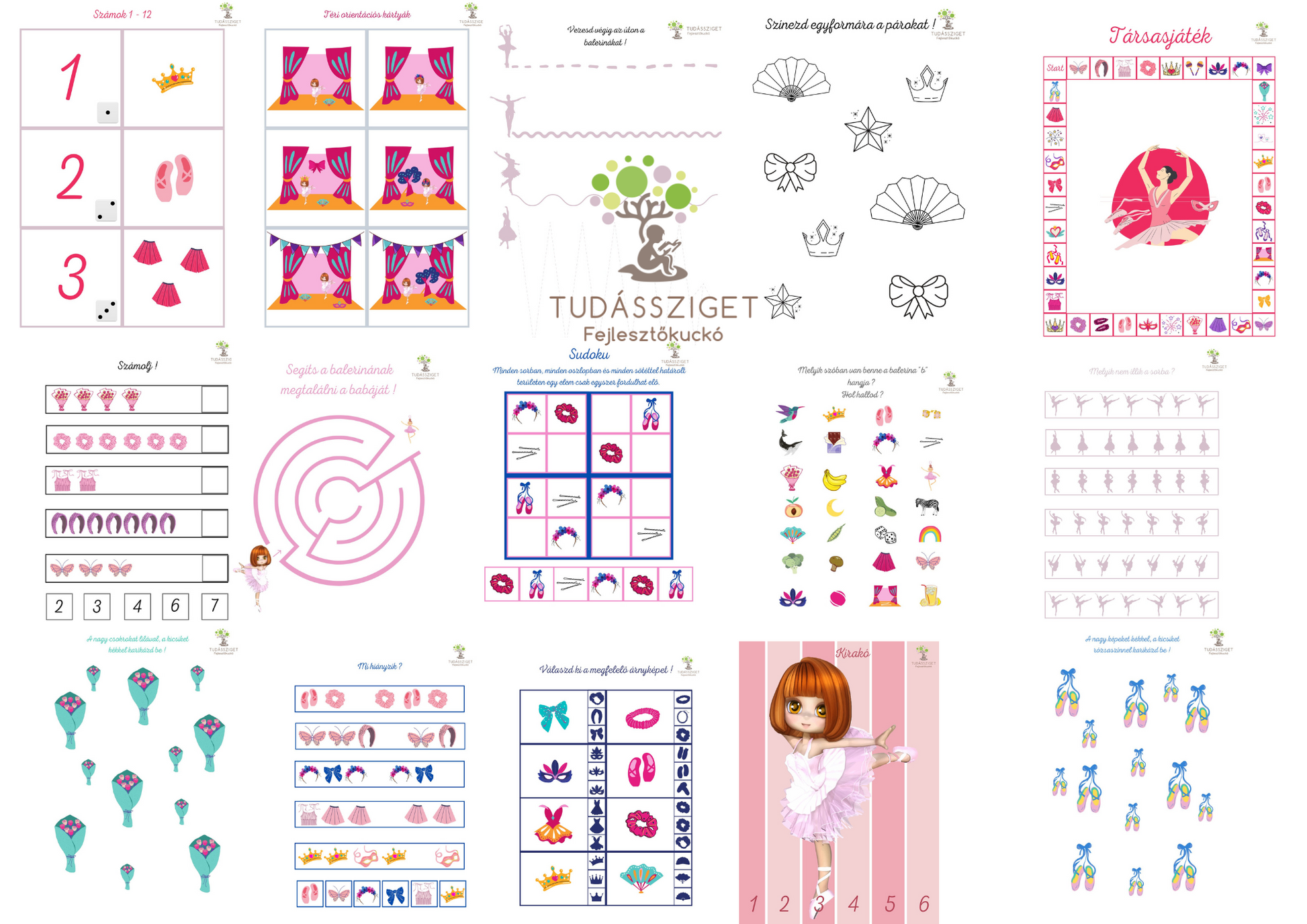 A fejlesztőcsomag 41 db A 4-es színes oldalból áll. A feladatlapok fejlesztik: a vizuális differenciálást, a vizuális alak-háttér differenciálást, a szerialitást, az intermodalitást, a téri orientációt, a grafomotoros- és a számolási készséget.