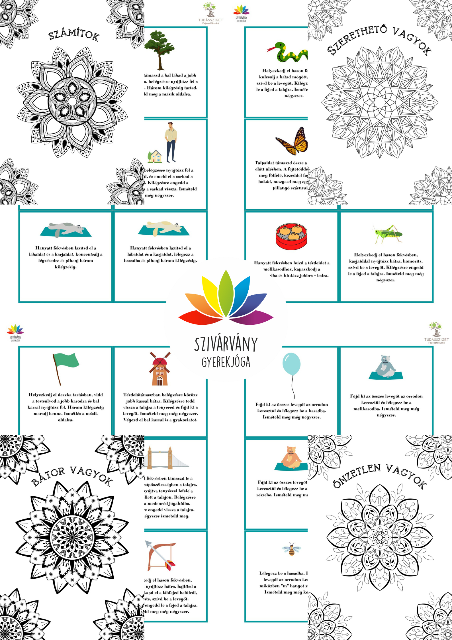 5 db A4-es oldal, amelyből 30 db kártya lesz. A képes kártyákon a gyakorlatok leírása szerepel, amellyel otthon egyedül is tudnak gyakorolni a gyerekek. - 11 db A4-es mandala színező megerősítésekkel.