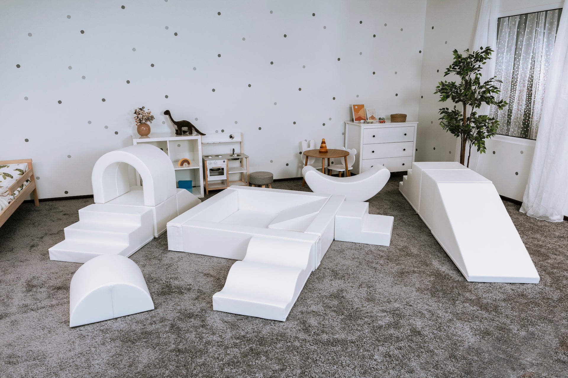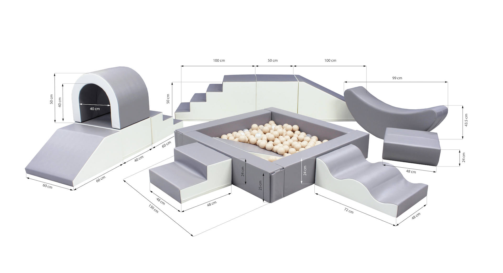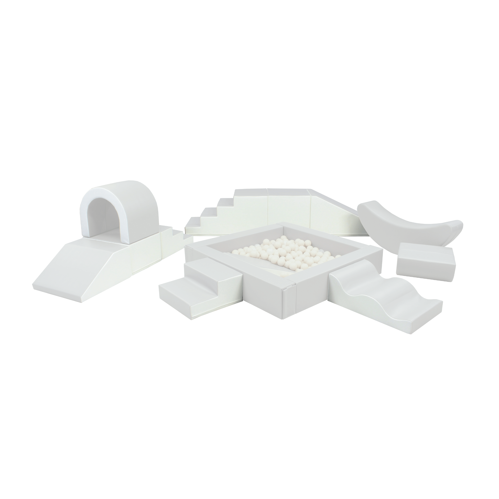 A készlet számos puha játékelemet tartalmaz, beleértve a blokkokat, csúszdákat, alagutat, hintázó banánt és rámpát, amelyek mindegyike puha és tartós műbőr szövettel van bevonva a maximális kényelem és biztonság érdekében. Az egyes tárgyak színei és egyedi kialakítása megragadja a gyerekek fantáziáját, így azonnali slágerré válik bármely partin vagy eseményen (élénk és lágyabb színváltozatok is elérhetők).