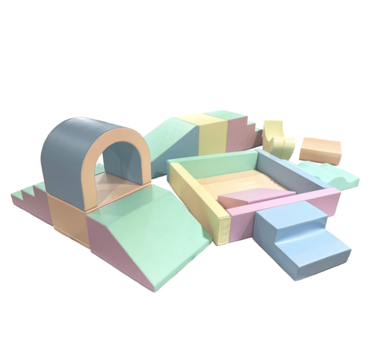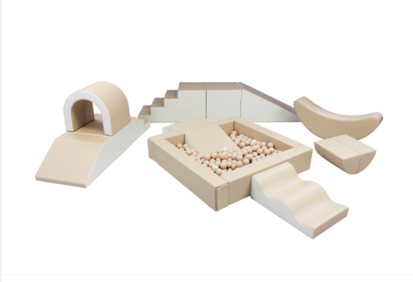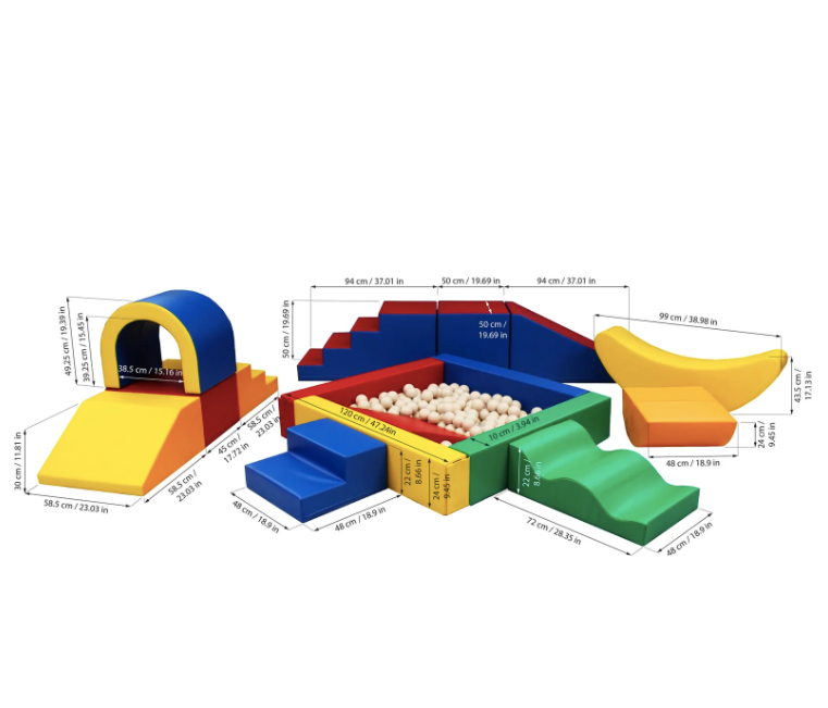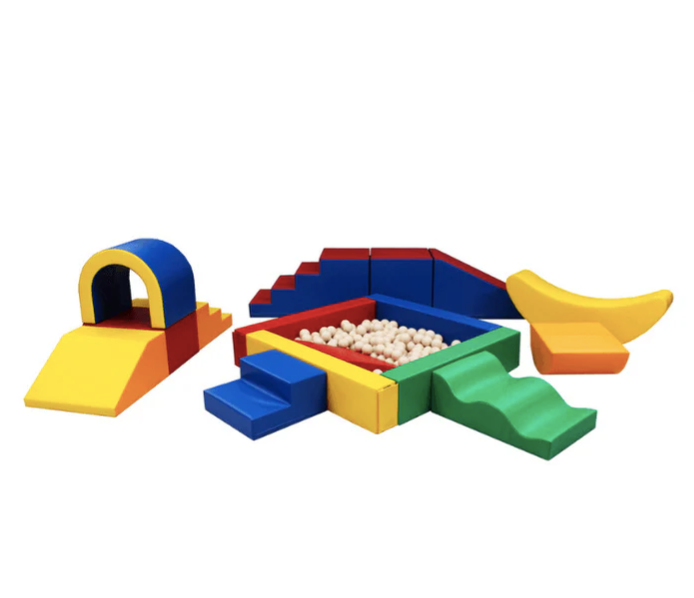 A készlet számos puha játékelemet tartalmaz, beleértve a blokkokat, csúszdákat, alagutat, hintázó banánt és rámpát, amelyek mindegyike puha és tartós műbőr szövettel van bevonva a maximális kényelem és biztonság érdekében. Az egyes tárgyak színei és egyedi kialakítása megragadja a gyerekek fantáziáját, így azonnali slágerré válik bármely partin vagy eseményen (élénk és lágyabb színváltozatok is elérhetők).