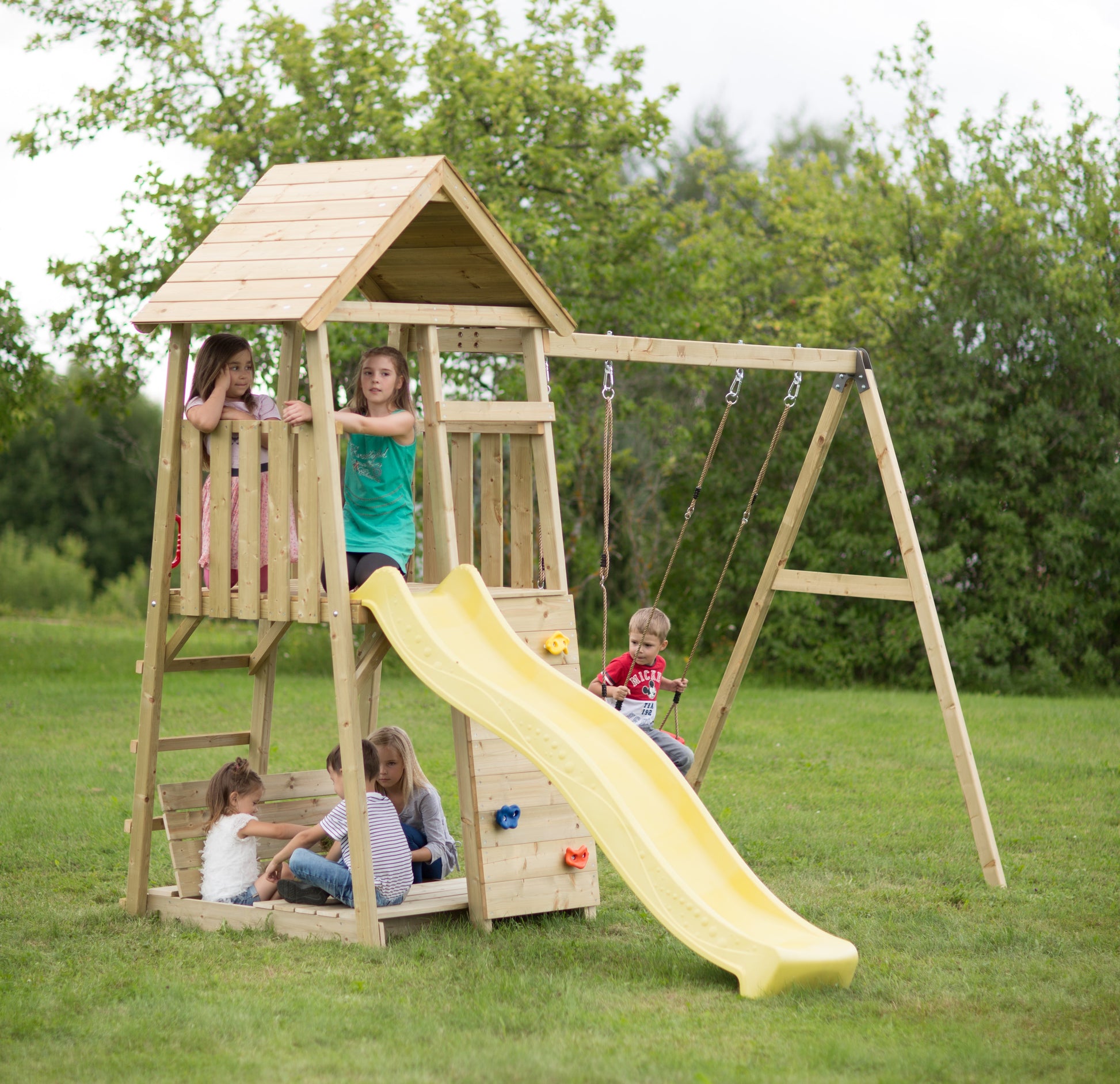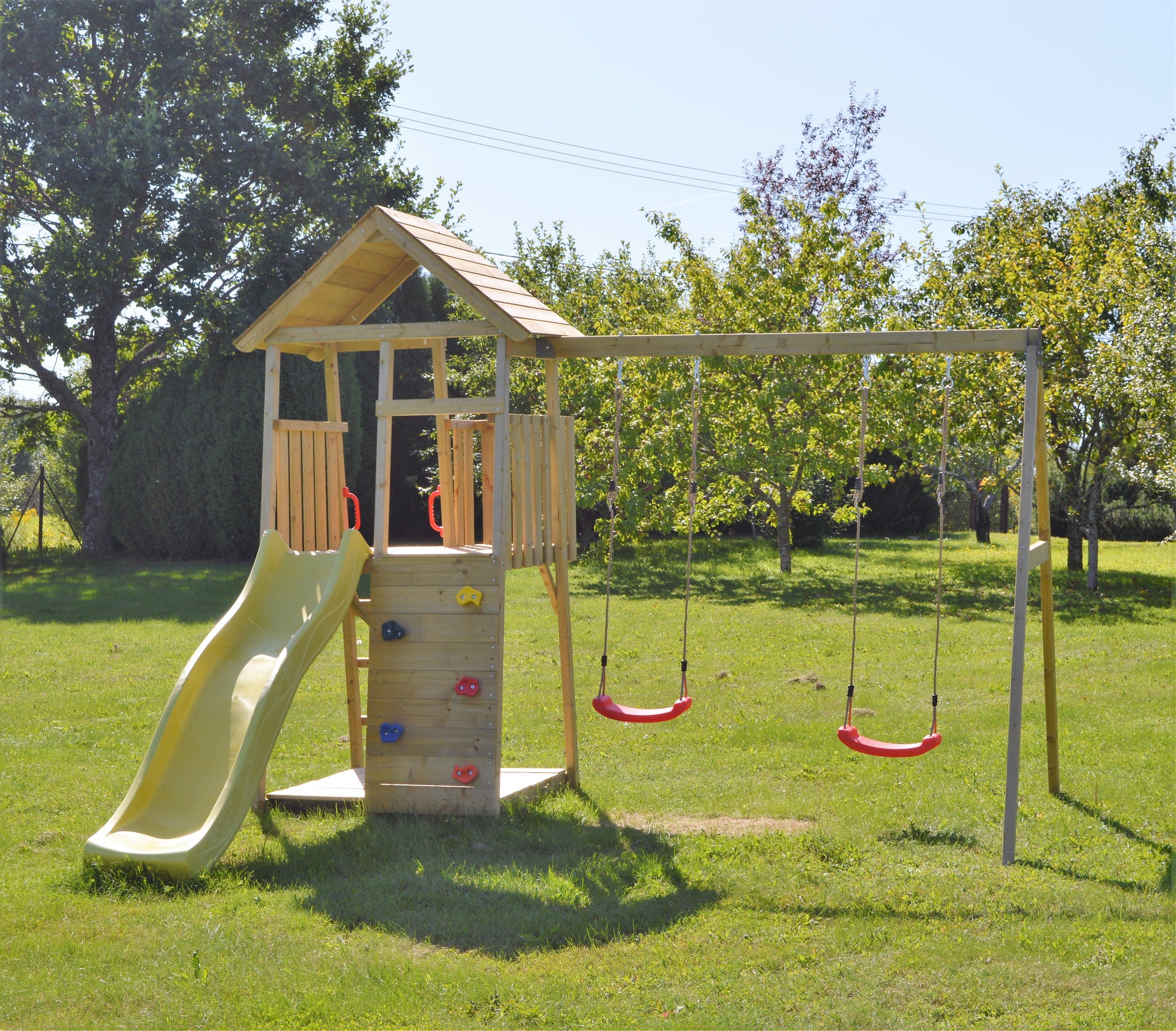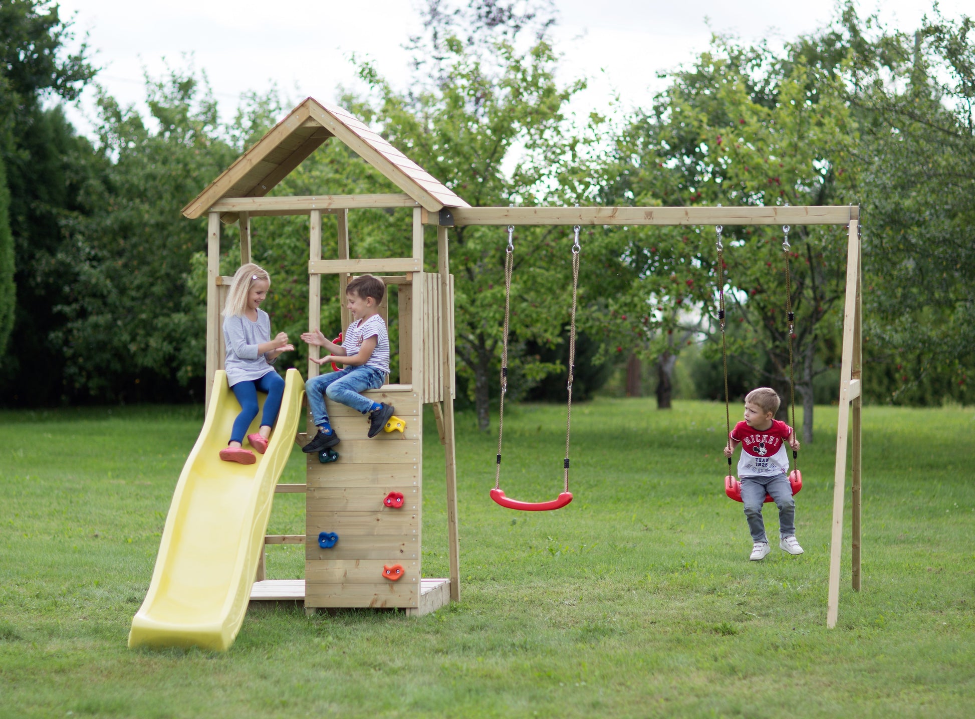 Játszóterünkkel a gyerekek mozoghatnak, játszhatnak és kreatívkodhatnak a friss levegőn. A mászófal segítségével történő felmászás során a kicsik is felülmúlják önmagukat, és egy 220 cm-es csúszdával felejthetetlen lecsúszással jutalmazhatják magukat. A játszótorony ugyanakkor a tetőnek köszönhetően kis búvóhelyként is funkcionál.