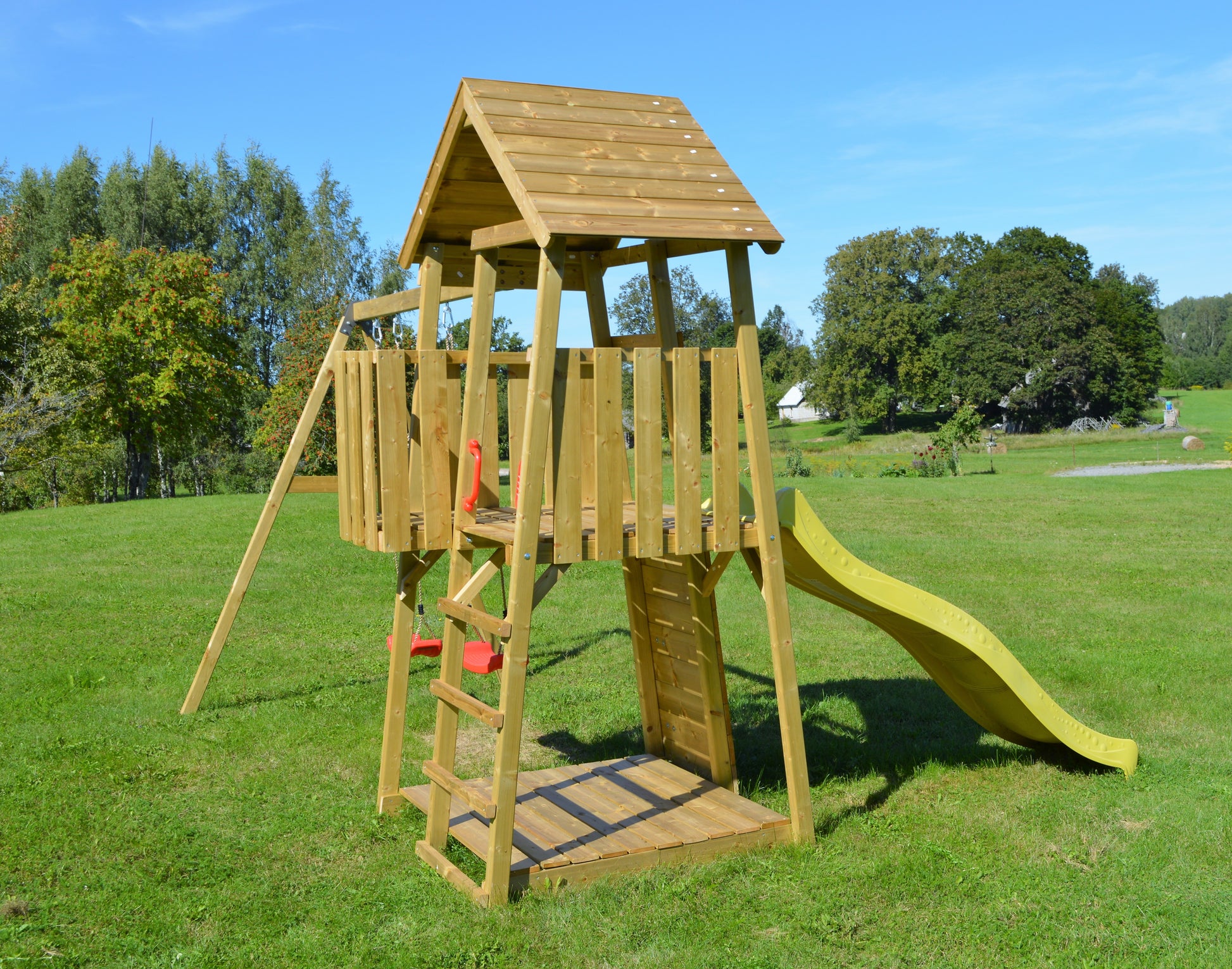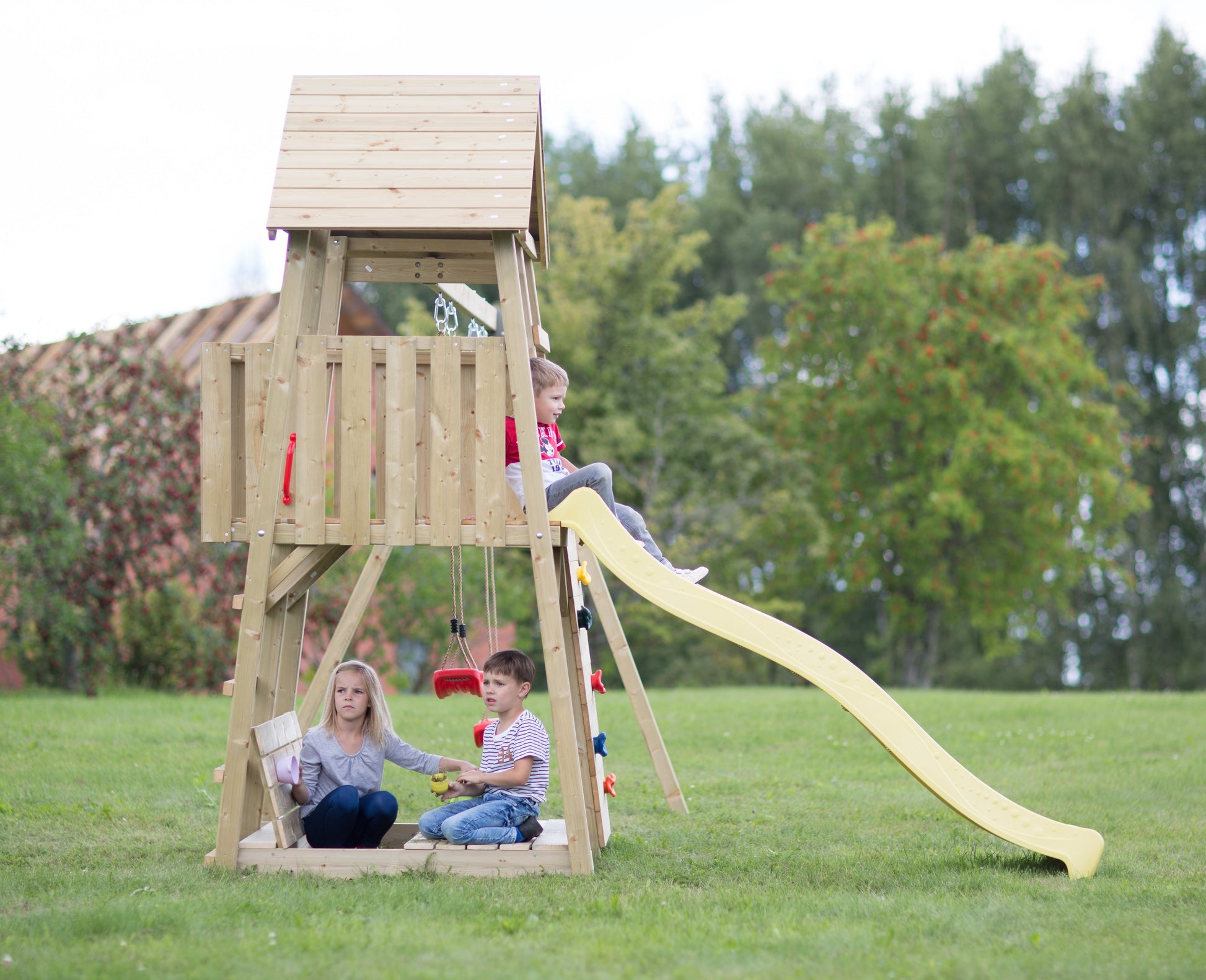 Játszótornyunk kiváló minőségű, nagy nyomás alatt impregnált északi luc/fenyőfából készül. Minden felhasznált fa FSC tanúsítvánnyal rendelkező erdőkből származik. A tartós fa időjárásálló és ellenáll a fa rothadásának. A játszótér megfelel az EN-71 európai szabványnak.