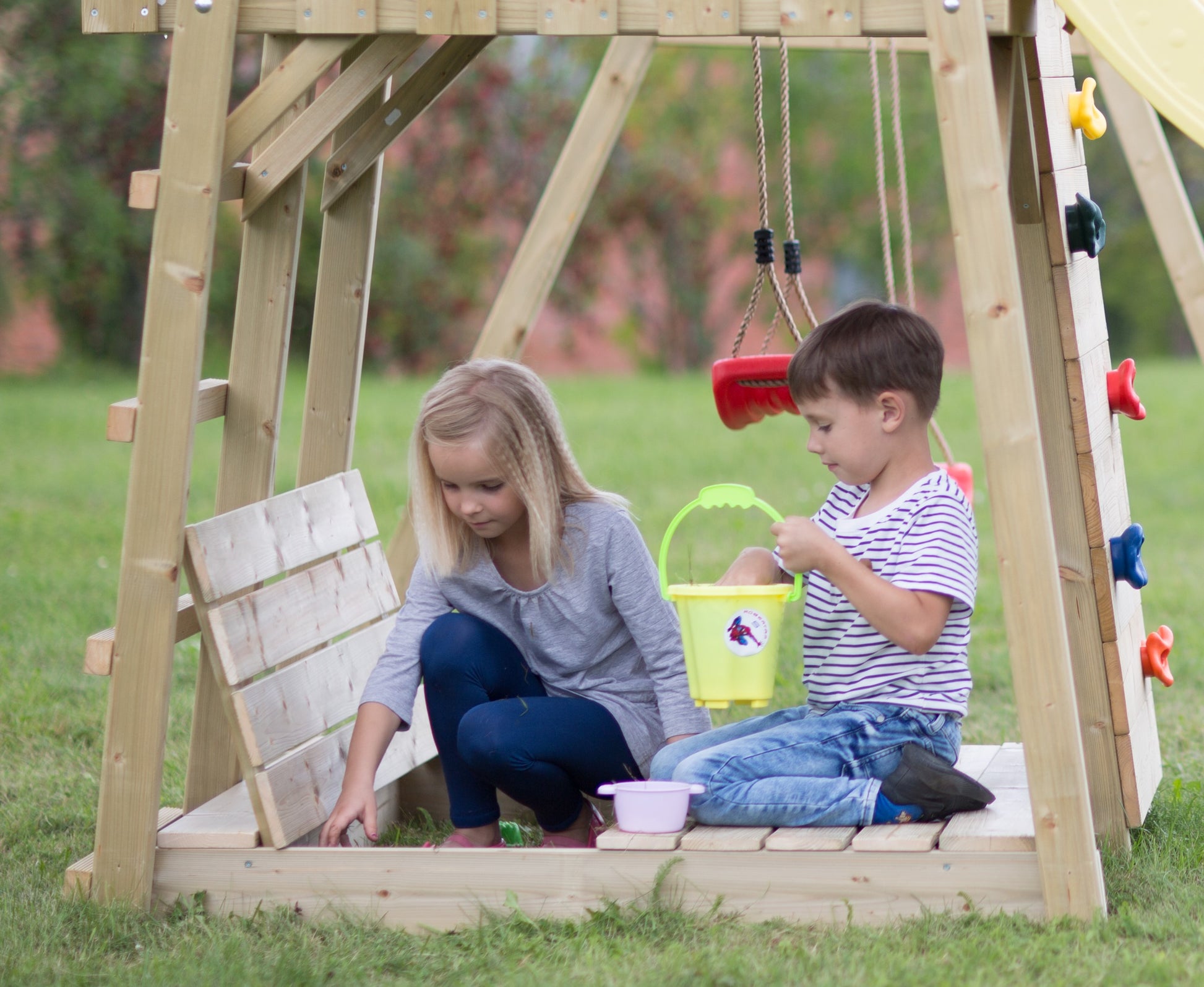 A torony alatt beépített homokozó található nyitható fedelekkel, melyek játék után zárhatók, így biztosítva a homok szárazságát és tisztaságát. A további szórakozást dupla hinták biztosítják, amelyek a torony oldalához vannak rögzítve.