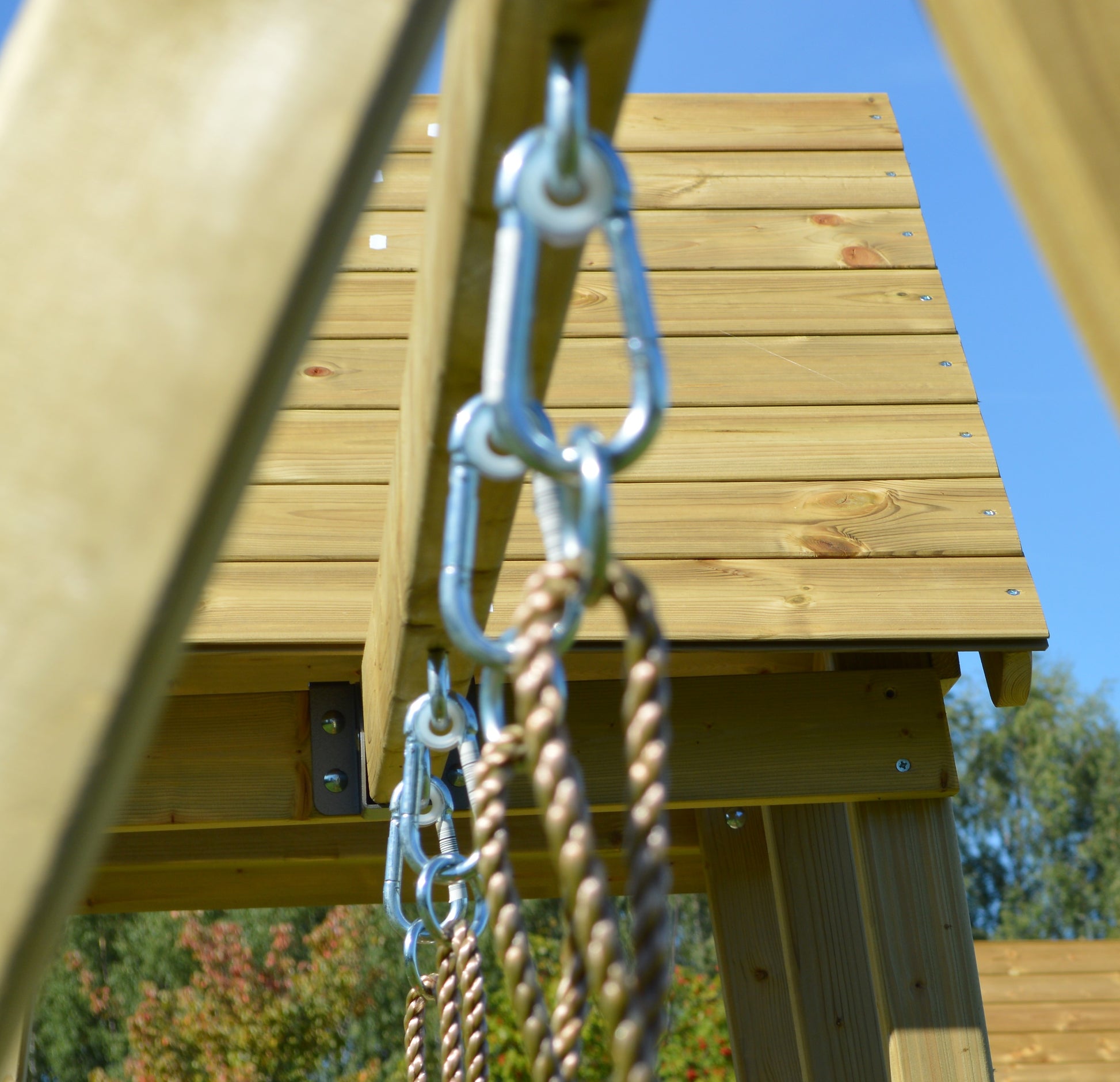 A torony biztonságát 44 x 69 mm vastag gerendák biztosítják. A játszótér stabilitása mellett 4 db vashorgony is jár hozzá, melyeket a talajba szúrva a fagerendákhoz csavaroznak.