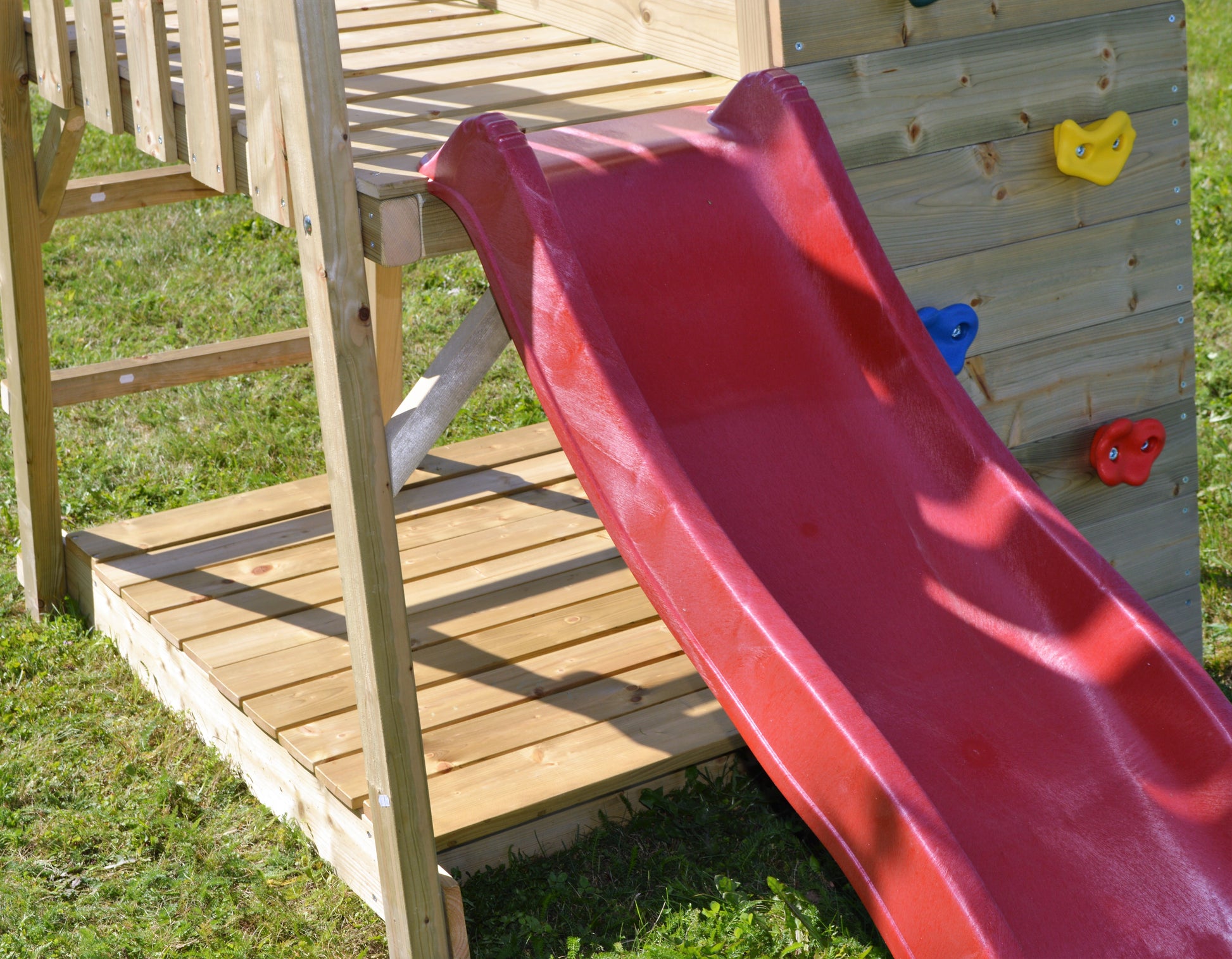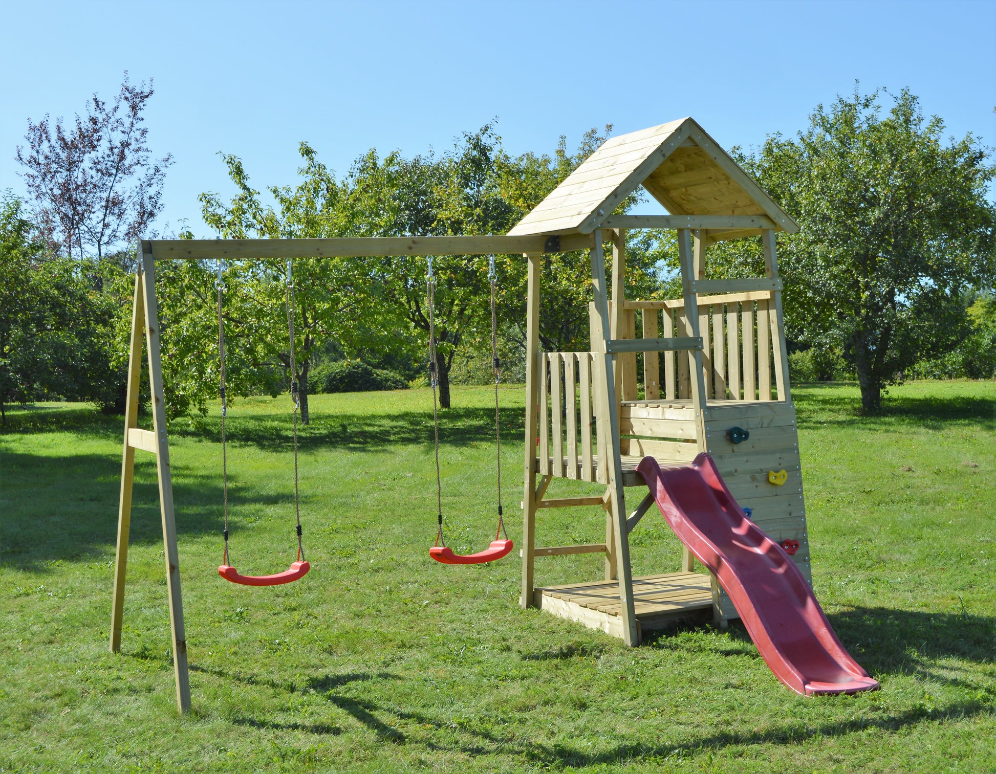 Játszóterünkön a gyerekek mozoghatnak, játszhatnak és kreatívkodhatnak a friss levegőn. A mászófal segítségével felfelé mászva a kicsik is felülmúlják önmagukat, és egy 175 cm-es csúszdával felejthetetlen lecsúszással jutalmazhatják magukat. A játszótorony ugyanakkor a tetőnek köszönhetően kis búvóhelyként vagy elvonulásként is funkcionál. A torony alatt beépített homokozó található nyitható fedelekkel, melyek játék után zárhatók, így biztosítva a homok szárazságát és tisztaságát. A további szórakozást a dupla ülőhinták biztosítják, amelyek a torony oldalához vannak rögzítve.