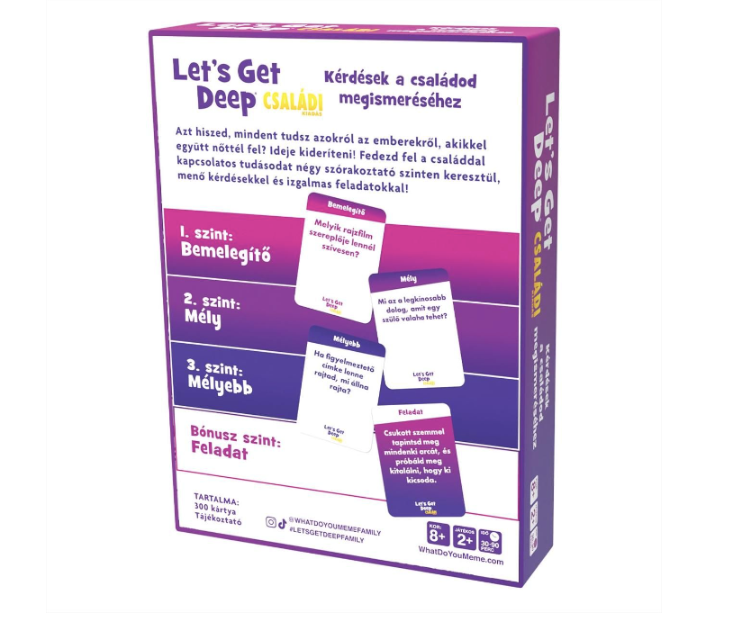 Ismered a családodat? Vajon mindent tudsz azokról, akik mellett felnősz vagy felnőttél? Megérkezett a What Do You Meme alkotóitól a Let’s Get Deep Családi kiadása, amiben három szinten találtok kérdés lapokat, melyek segítenek jobban megismerhetitek egymást, és közelebb hozhatjátok egymáshoz a famíliát. 50 jégtörő, 100 mély és 100 méllyebb kérdéskártyával.