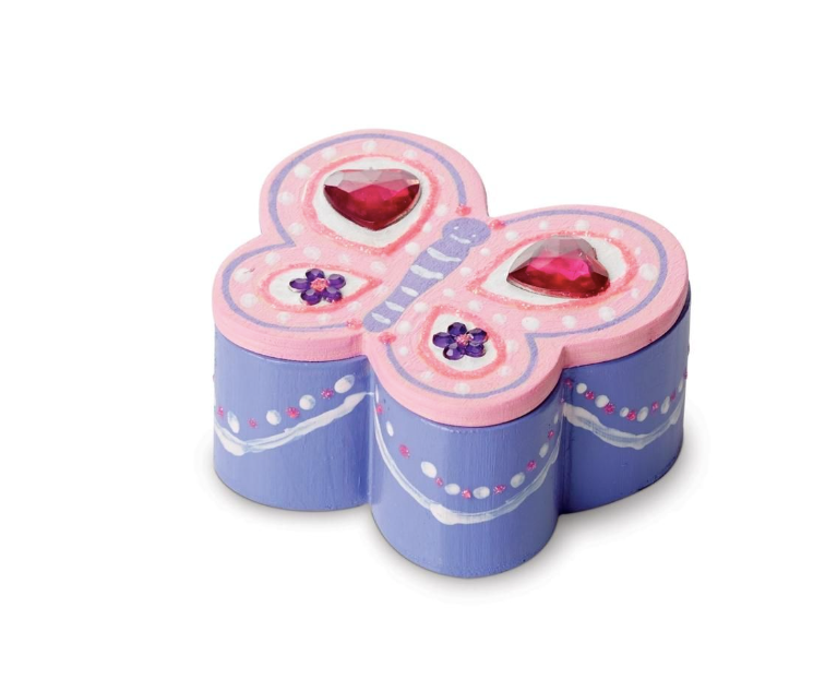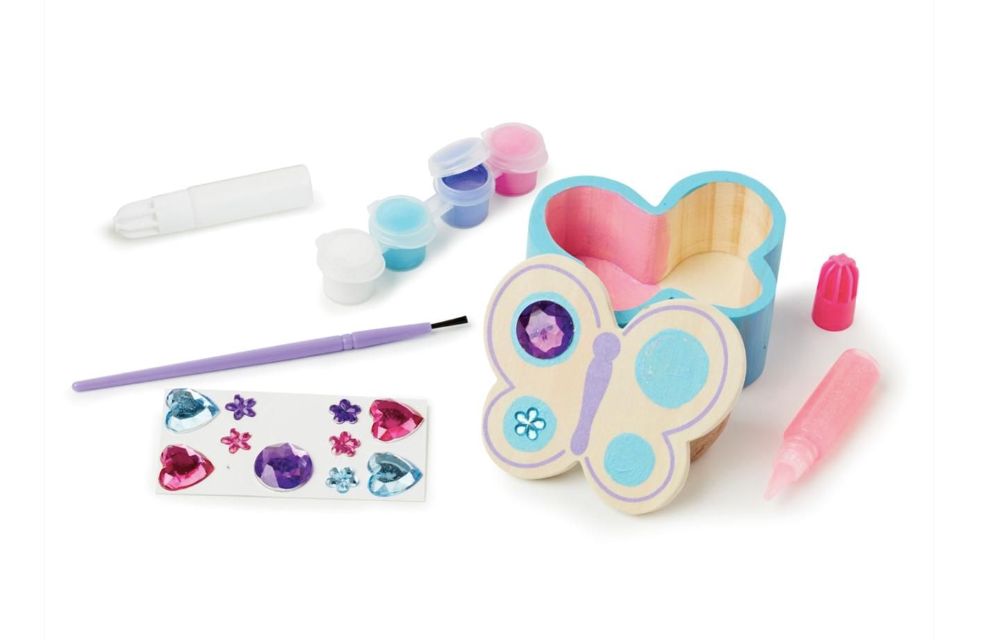 Ez a speciális, kis varázsdoboz minden bizonnyal be fogja ragyogni gyermeked fantáziáját. A készlet tartalmaz egy pillangó alakú kis dobozkát (7,9 x 3,6 x 5,1cm), csillámporos ragasztó, fehér ragasztót, csodaszép színekben pompázó ékszermatricákat, 4db festéket és egy ecsetet. Kiváló elfoglaltságot nyújt esős időben! A játék bizonyos részeinek lenyelése fulladást okozhat. Apró darabokat tartalmaz! 3 éves kor alatt nem ajánlott. ASTM D-4236 szabálynak megfelel. Méretei: 19 x 14 x 4,4cm. Súlya: 0,2kg