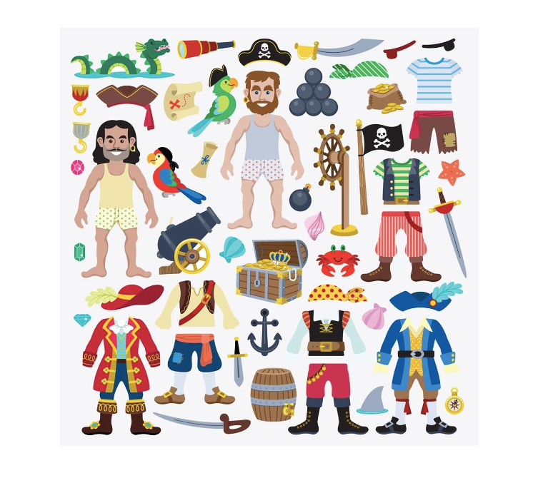 Öntapadós matricás füzet kalózos témával. A matricák a füzetből újra felszedhetők és új helyszínre ragaszthatóak éppen ahogyan a gyermek fantáziája diktálja. A matricák egymásra is ragaszthatók, így a gyermek újra és újra megújíthatja a kalózok ruházatát.