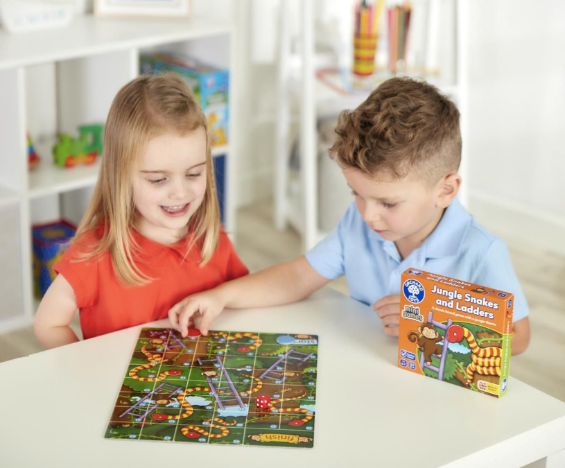 Ez a klasszikus társasjáték két játékot tartalmaz egyben. Először állítsd össze a kirakós elemeit, és ha feltárult előtted a társasjáték táblája, már kezdődhet is a következő móka. Ki jut fel először a fák koronájához? A létrák jó barátok és segítenek téged az előrehaladásban, azonban a mosolygós kis kígyók farkán bizony könnyen visszacsúszhatsz jó pár mezőt, ezért ügyelj hova lépsz! A dobókocka segítségével haladjatok lépésről lépésre felfelé a dzsungel fáin.