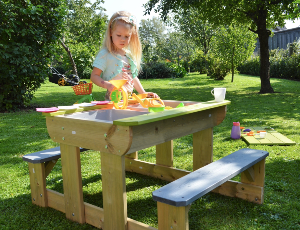 The Wendi Toys® multifunctional picnic play table with benches is perfect for families with young children who like creative and outdoor play. This versatile table offers endless opportunities for children to play, paint, build sand castles or do crafts. The table has a removable lid under which there are two plastic bowls for sand and water, so children can use the bowls for imaginative play. The bowls are easy to remove and easy to clean. The lid also ensures that the sand stays dry and clean inside the table, even in bad weather.