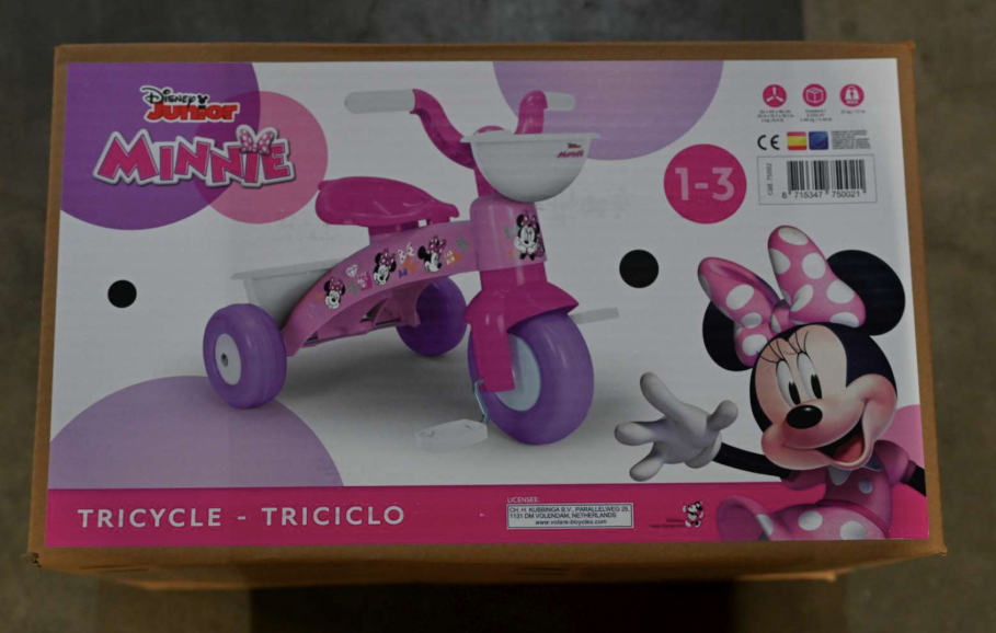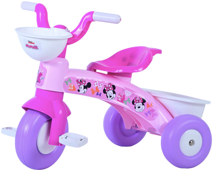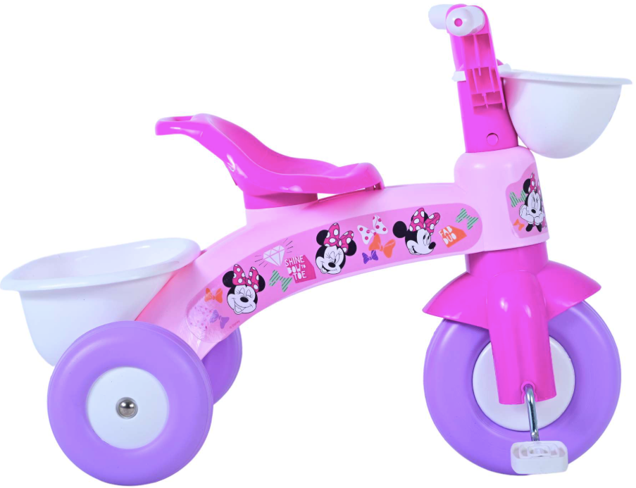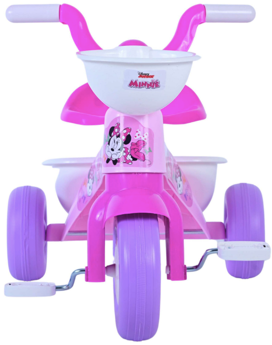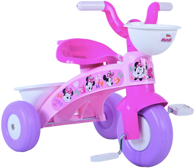 A tricikli rózsaszín színű, gyönyörű Disney Minnie egér képekkel. A tricikli elöl és hátul kosárral rendelkezik, így gyermeke magával viheti kedvenc játékait. 1 és 3 év közötti gyermekek számára alkalmas, teherbírása 25 kg.