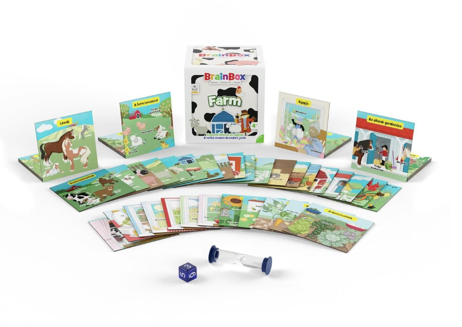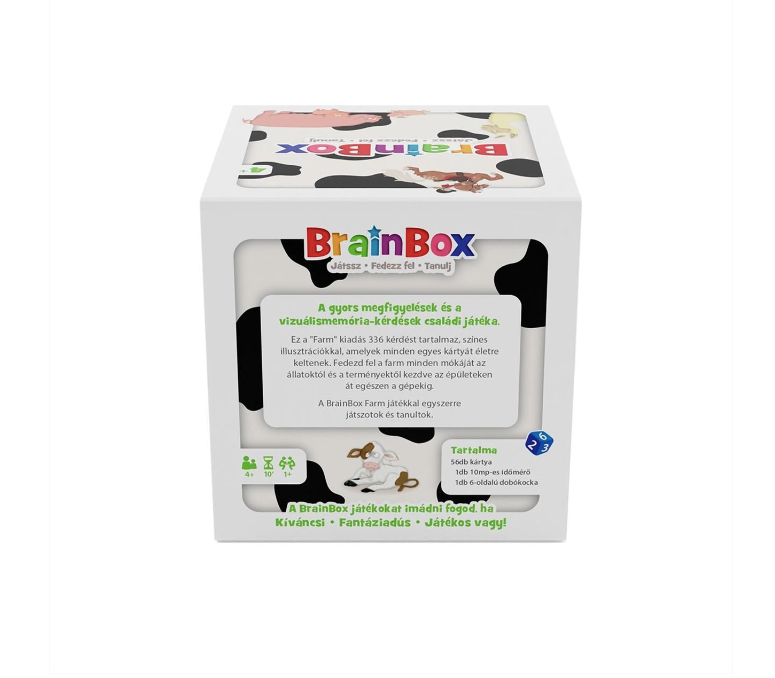Remek agytorna és szórakozás, egy vagy akár több játékos részére! A BrainBox Farm lényege, hogy 10 másodperc alatt minél több mindent meg kell figyelni a kihúzott kártyán szereplő tárgyról, állatról. Ezután dobókockával kell dobni, és a kockán szereplő sorszám szerinti kérdésre kell helyesen válaszolni. A homokóra méri az időt, a kártyán ellenőrizhető a válasz. A doboz tartalma: 56 db kártya, 1 db homokóra, 1 db dobókocka, 1 db szabálykártya.