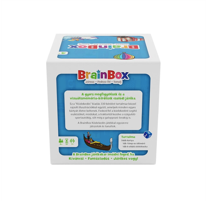 Szeretnél 10 perc alatt kamionban ülni, tengeralattjáróval utazni, majd kutyaszánt hajtani? A BrainBox Közlekedés remek agytorna és szórakozás, egy vagy akár több játékos részére! Csak a megfigyelőképességed és a memóriád kell hozzá! Koncentrálj és jegyezz meg minél több információt 10 másodperc alatt a kihúzott kártyán lévő képről, majd dobj a kockával és válaszolj helyesen a kidobott szám szerinti kérdésre. Ha jó megfigyelő vagy, Te lehetsz a közlekedés szakértője!