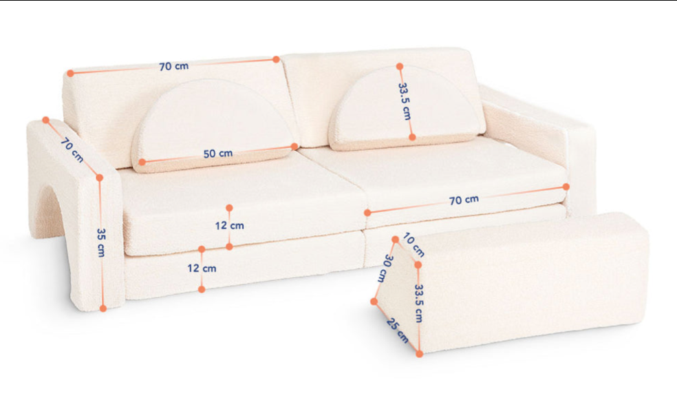 A 10 moduláris részből álló játékkanapé számtalan módon átalakítható, hogy bármilyen tevékenységhez illeszkedjen. Gyermeke várat építhet, akadálypályákat hozhat létre, vagy egyszerűen csak pihenhet. Serkenti a fantáziát, és fizikai aktivitásra ösztönöz, mivel a gyerekek minden nap másznak, ugrálnak és új konfigurációkat fedeznek fel.