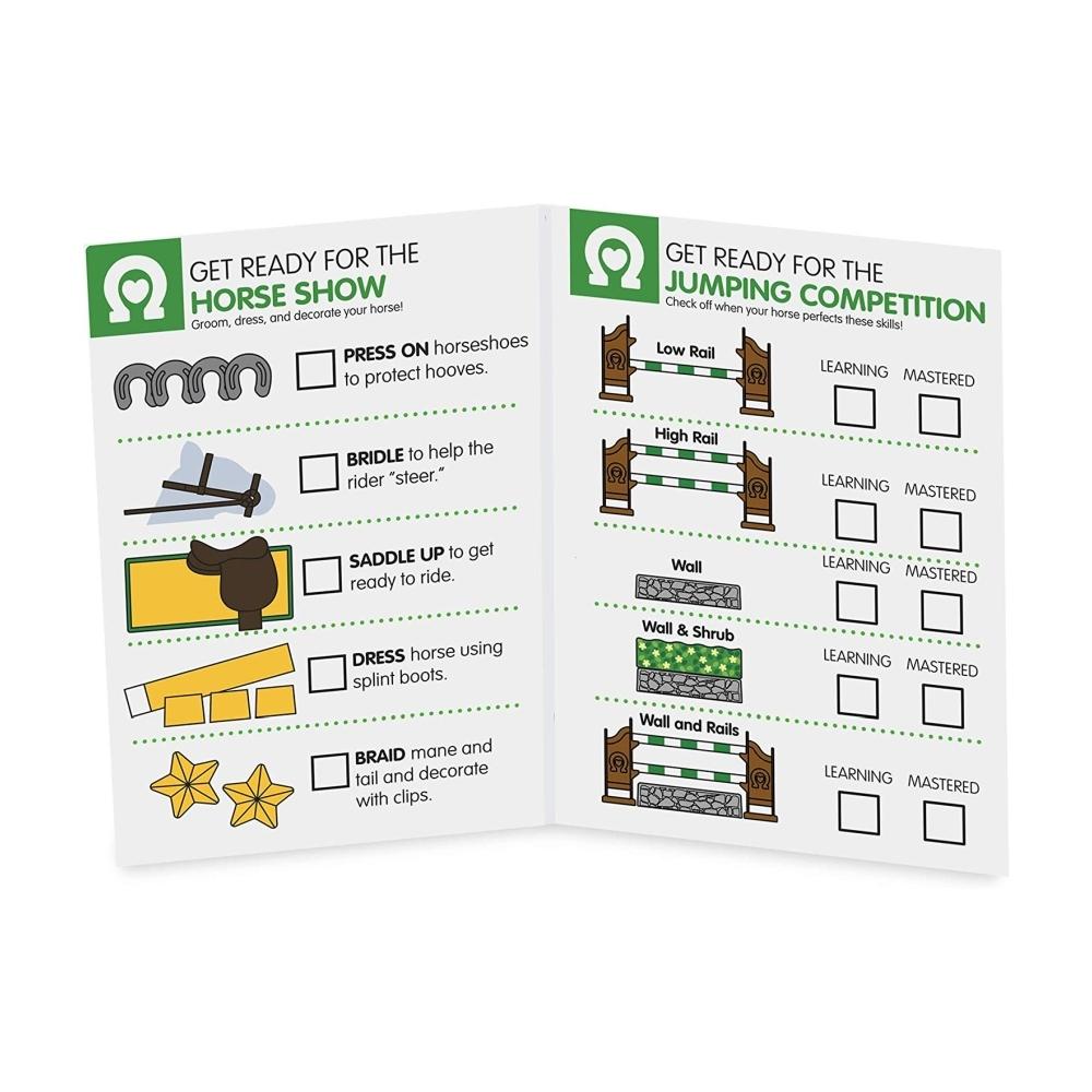 - tartalmaz 4 öntapadó patkót, kantárt, nyerget és párnát, 4 lábszárvédőt, 2 csatot fonathoz, 2db dupla sínes akadályt, falat, cserjét, szalagot, koszorút, dobogót, újrafelhasználható edzésnaplót, akadálypálya játékszőnyeget